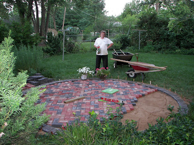 Almost done with the circle; notice the pile of pavers has gone way down in the picture below. After we finished the circle, we decided to make a couple of paths behind it and a landing for the water hose--more pavers. We just kept adding on until we were happy. Then we swept sand into the cracks.