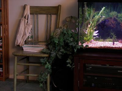 This is a picture of our pond with a periwinkle blooming on the edge.